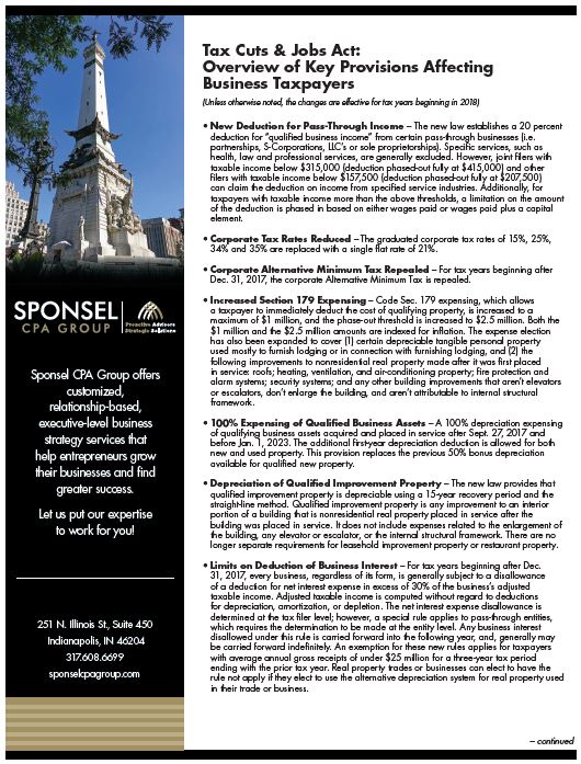 Sponsel CPA Group has developed two highlight sheets which provide a helpful recap of some of the most significant tax reform changes. It’s part of our ongoing effort to bring as much clarity as possible to our valued clients about the most significant changes to the tax code in three decades.